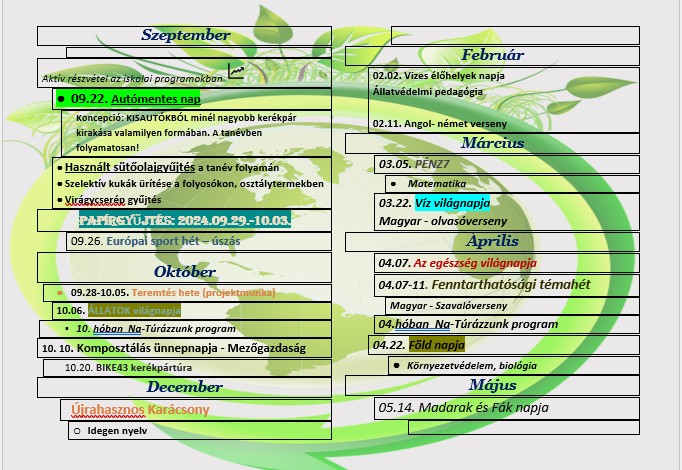 Jeles napok megünneplése során kiemelt figyelmet kap az állatok világnapja, a föld napja, a víz napja és a madarak és fák napja, komposztálás ünnepnapja, mely minden évben valamely formában megünneplésre kerül.